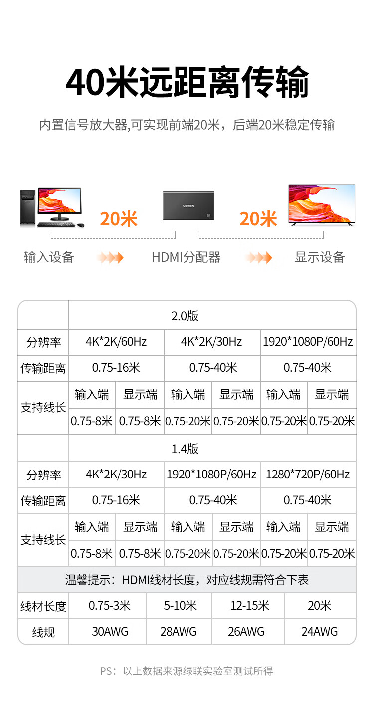 绿联 HDMI分配器 一分二4K30Hz 1进2出视频分屏器