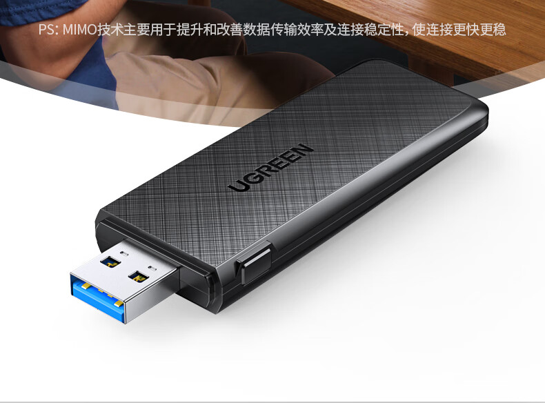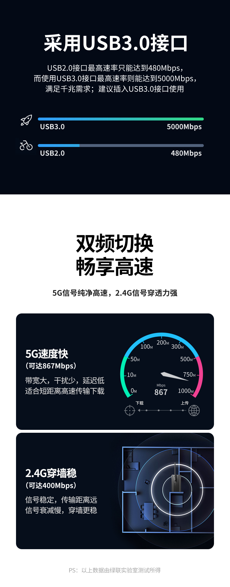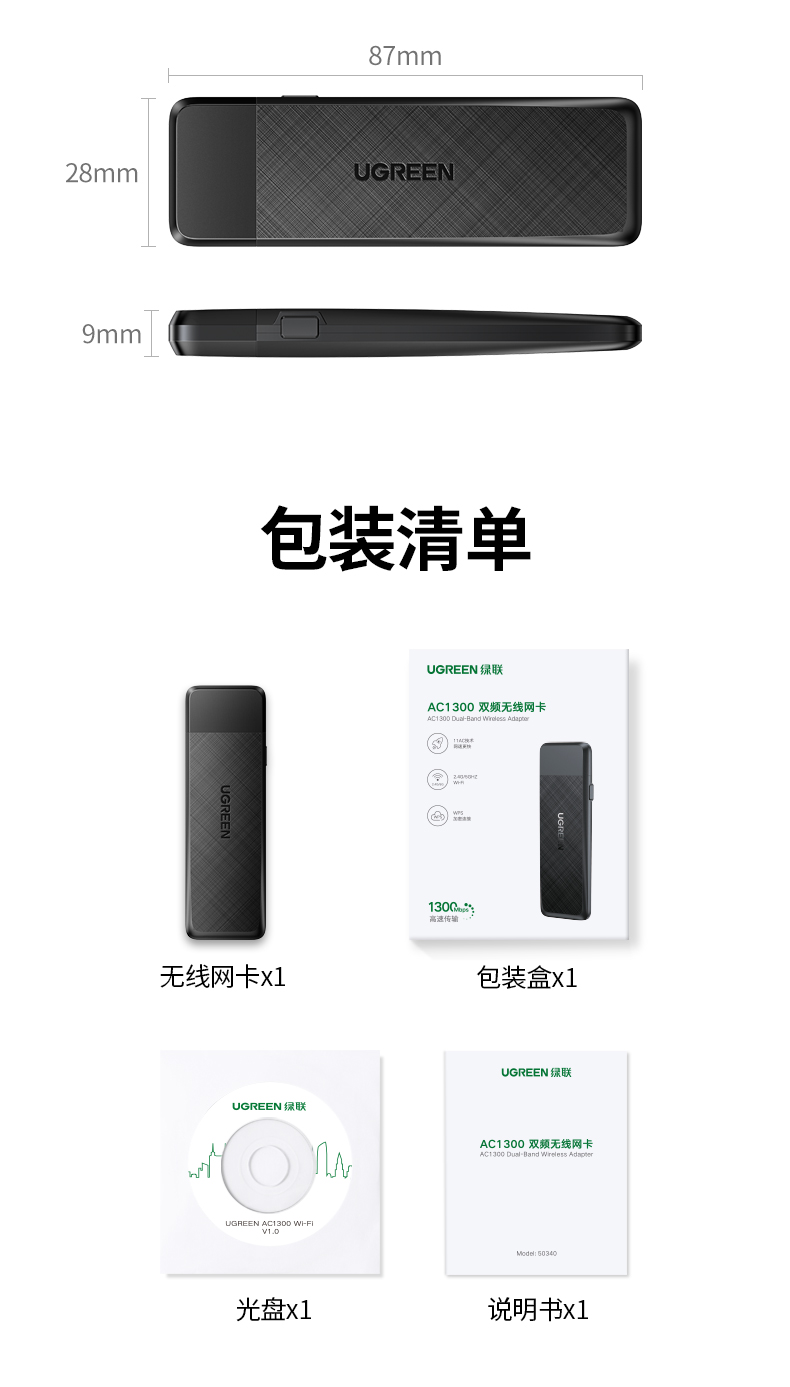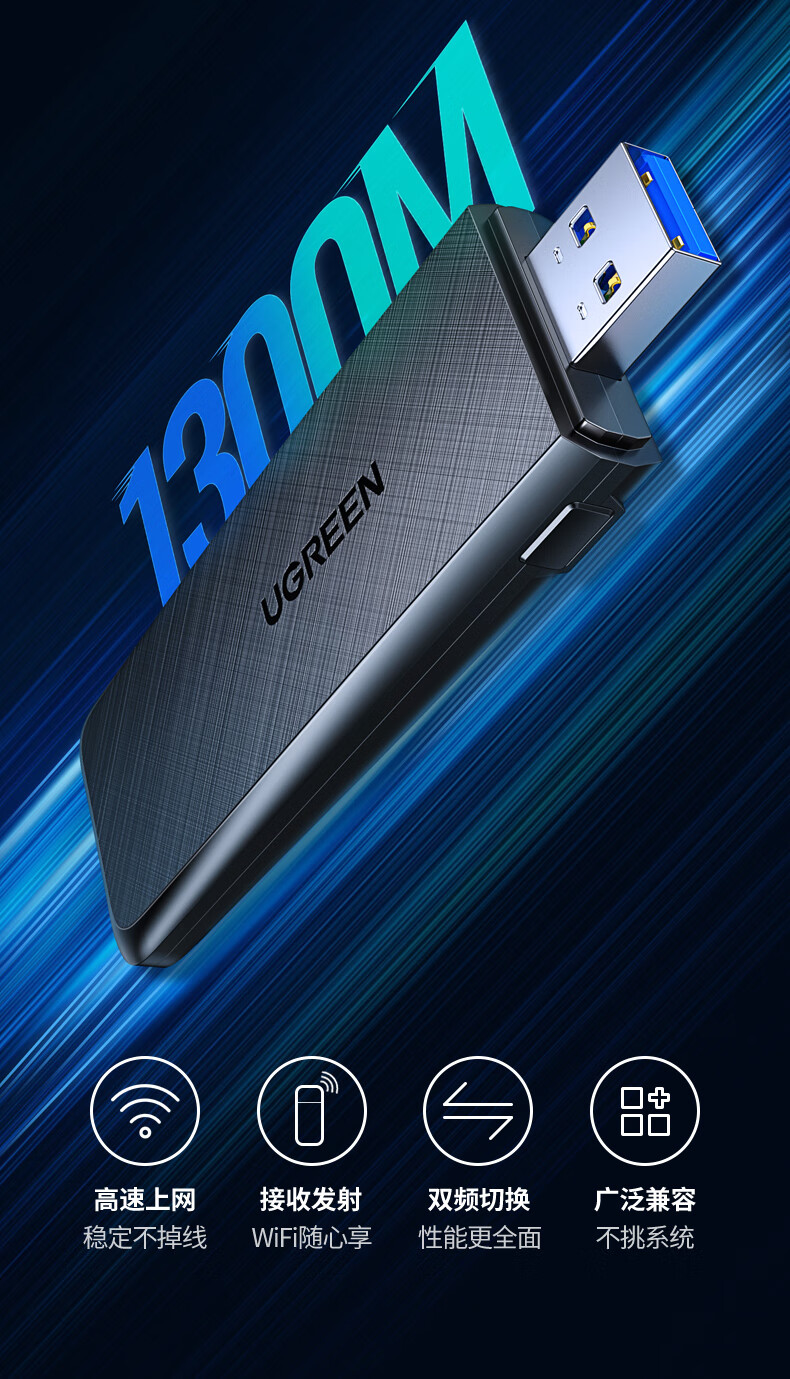 绿联 USB无线网卡免驱动 台式电脑WiFi接收器 AC1300M双频5G千兆高速网卡 自营